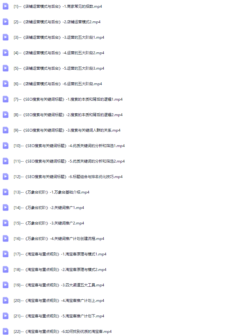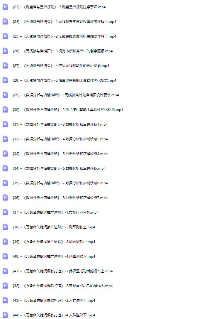 - 主要内容包括:关键词推广、SEO搜索与关键词组合、无线端权重与视觉的核心秘密、数据分析与店铺诊断、淘宝万象台进阶和高阶等。