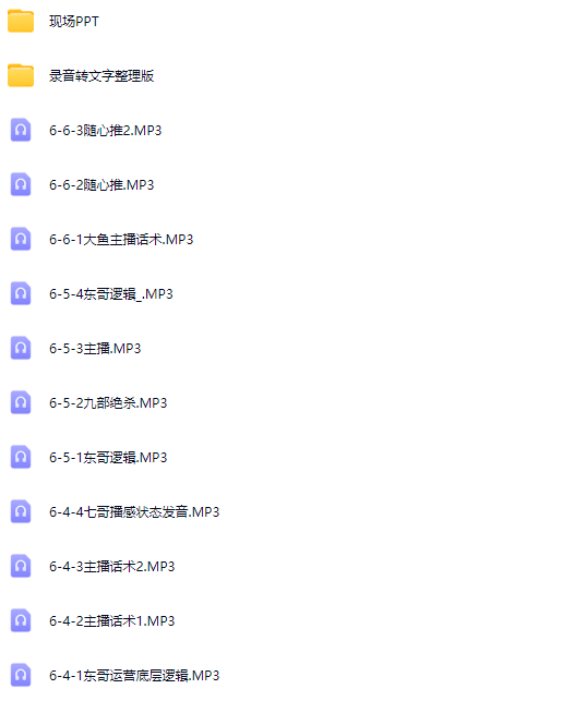 - 直播搭建、起号、运营型主播、直播运营、随心推独家打法等,23小时全程录音带字幕+现场图片+文字整理