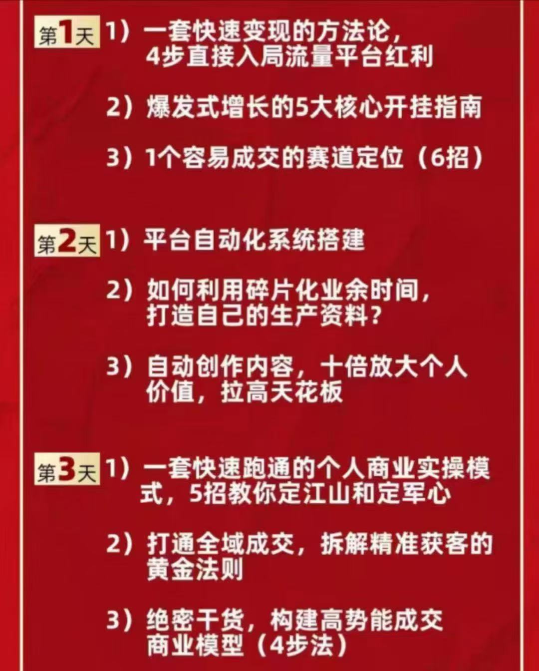 4天线上私密闭门会,从快速变现方法论、流量平台红利入局,到平台自动化系统搭建、碎片化时间利用,再到全域成交打通,全是实操干货!教你打造“只工作不上班”的商业变现模式,提升时间价值10倍 !