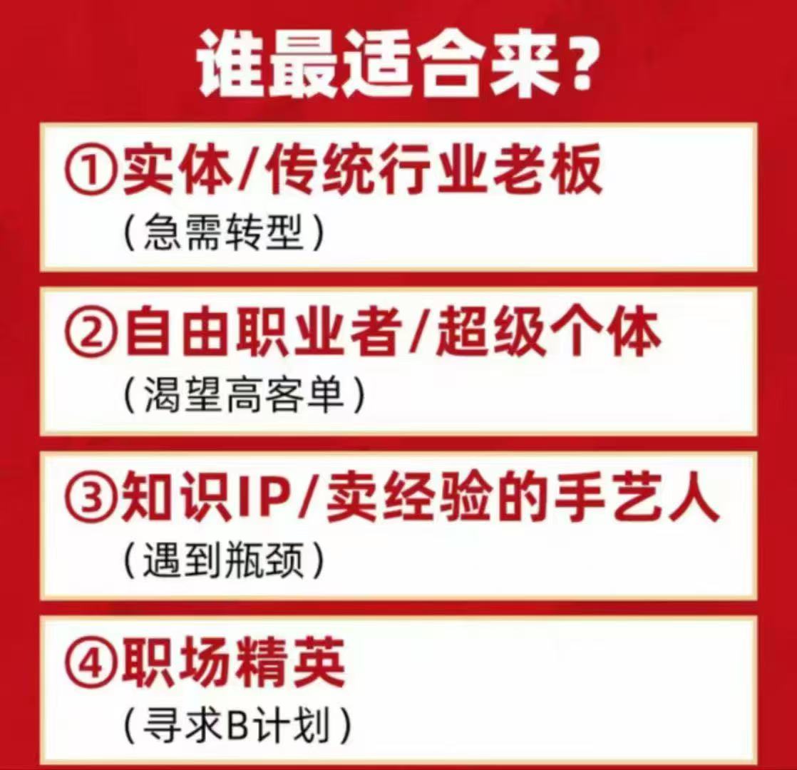 实体/传统行业老板(急需转型)、自由职业者/超级个体(渴望高客单)、知识IP/手艺人(遇到瓶颈)、职场精英(寻求B计划) ,想抓住知识付费风口、搞钱的别错过!