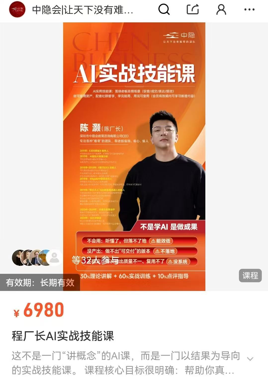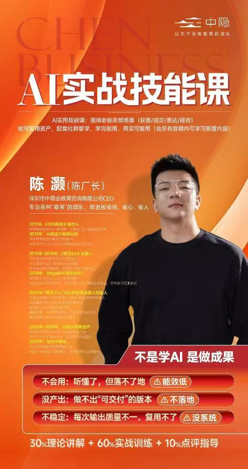 • 这不是一门”讲概念”的AI课,而是一门以结果为导向的实战技能课。课程核心目标很明确:帮助你真正掌握AI领域的核心能力,把AI从”听懂了”变成”能用,能做,能交付,能复用”。无论你是个人想提升能力,还是企业想把AI用进业务,这门课都能帮你快速建立一套可落地的方法和执行路径。很多人学AI会遇到这几个问题:听懂了但用不出来,做不出可交付成果,每次输出不稳定,无法复用到工作里。这门课就是围绕这些问题来设计的不是教你”知道A I”,而是教你用AI做成果。课程采用30%理论讲解+60%实战训练